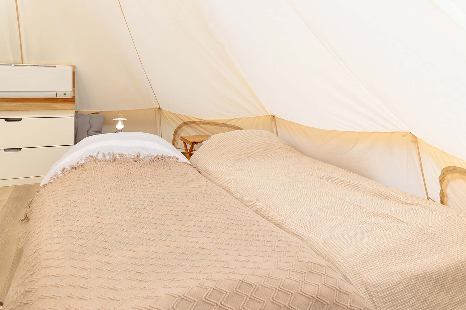 Equipment | 2 single beds + 2 extra beds Spacious 20 m2 glamping bell tent + private water tent (washroom and toilet) Open-air stay with private terrace ※Furniture and other items are subject to change. ※For bedding quantities exceeding the above, we can accommodate requests as optional extras. |